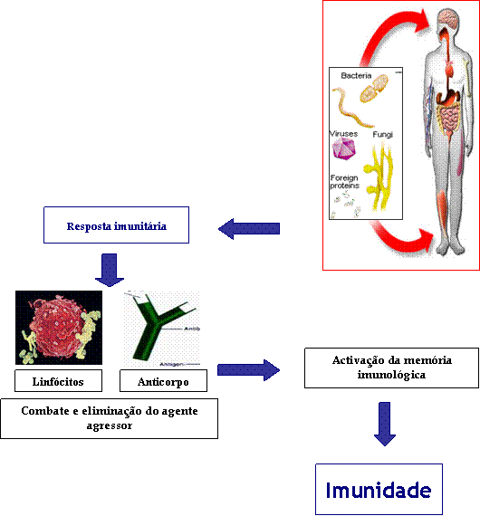 Quando se contrai pela primeira vez uma doença o sistema imunitário produz anticorpos e vários tipos de linfócitos específicos para atacar e destruir o agente infeccioso. Após a recuperação do individuo estas células de defesa especificas são armazenadas através da “memória imunológica” e, no caso de uma segunda invasão por micróbios da mesma espécie, estas reproduzem-se muito mais rapidamente, impedindo a doença de se desenvolver ou reduzindo a sua gravidade. Dizemos, assim, que o indivíduo adquiriu imunidade. |